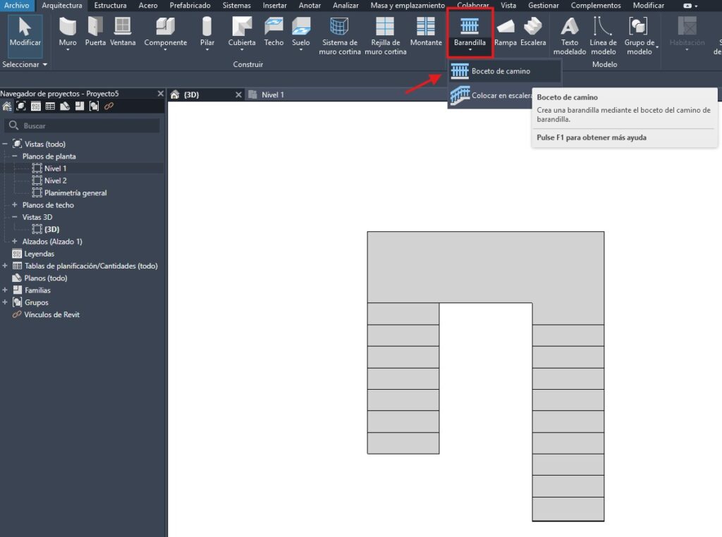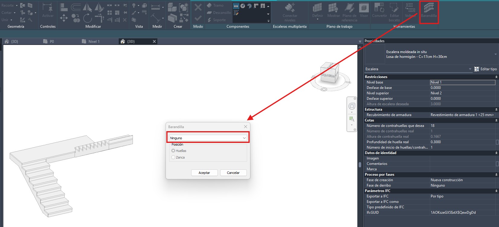 Por otro lado, si queremos crear una barandilla en una escalera ya modelada tenemos dos opciones: