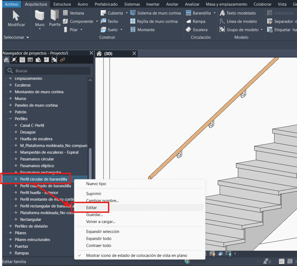 Para editar o crear perfiles de barandilla/barandal/pasamanos seguimos los siguientes pasos: