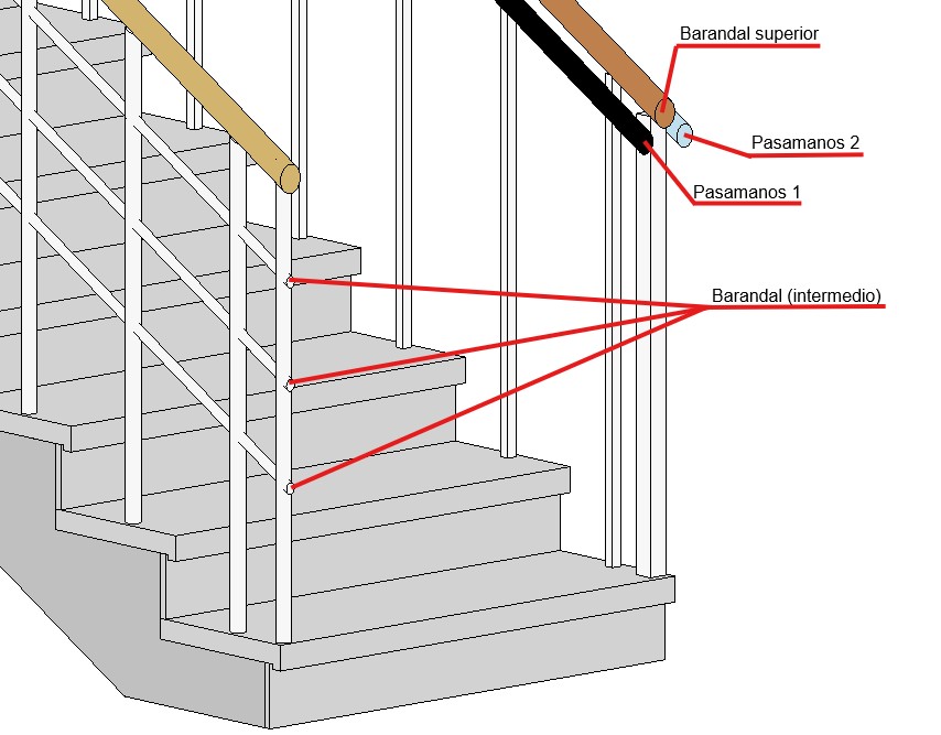 - Pasamanos: elemento superior y longitudinal del barandal, diseñado para apoyar la mano al subir o bajar.