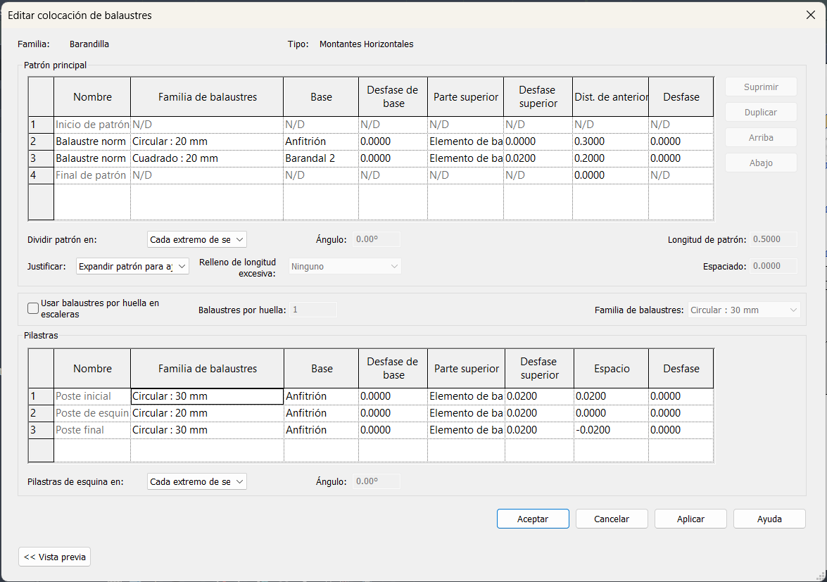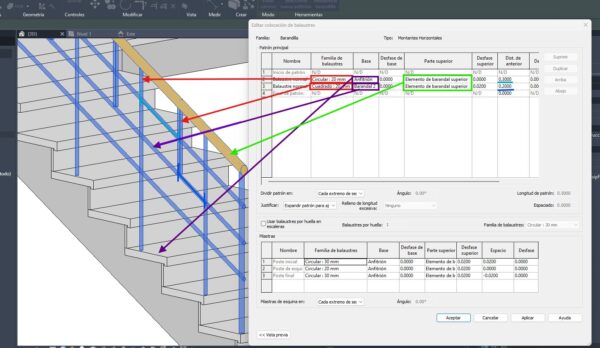 - Colocación de balaustres: abre un cuadro de edición donde se define el patrón, espaciado y tipo de balaustres usados en la barandilla.