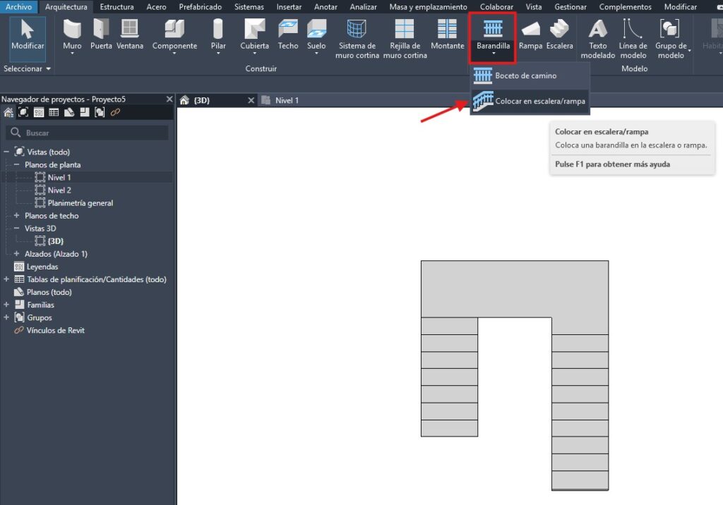- 2º Colocarnos en la vista adecuada: se recomienda colocarse en una vista 3D u otra donde veamos la totalidad de la escalera, no solo una parte de ella.