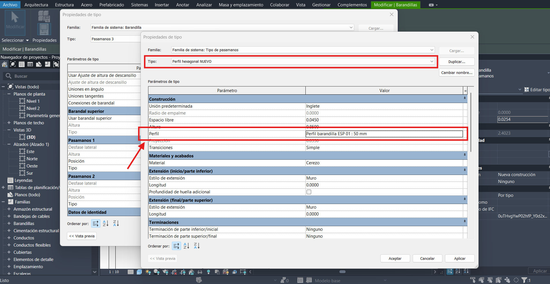 - 4º Cargar la familia en el proyecto. Una vez carguemos la familia en el proyecto podemos incluirla en nuestra barandilla. Para ello vamos a las propiedades de tipo del elemento donde queremos aplicar este perfil (pasamanos, barandilla, etc.) y lo seleccionamos: