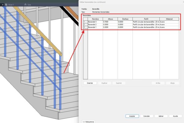 Al pulsar, se nos abrirá la ventana donde nos aparecerán todos los barandales añadidos a nuestra barandilla junto con sus parámetros:
