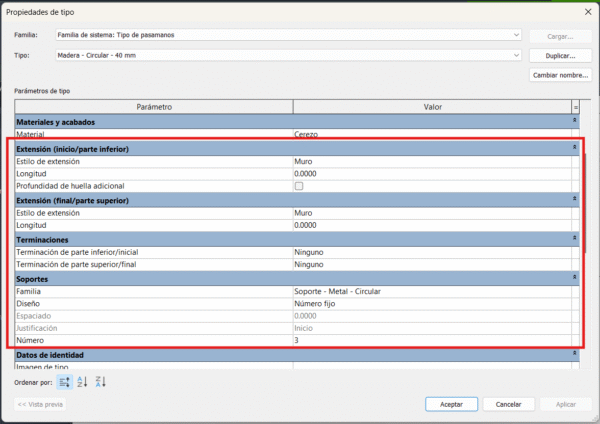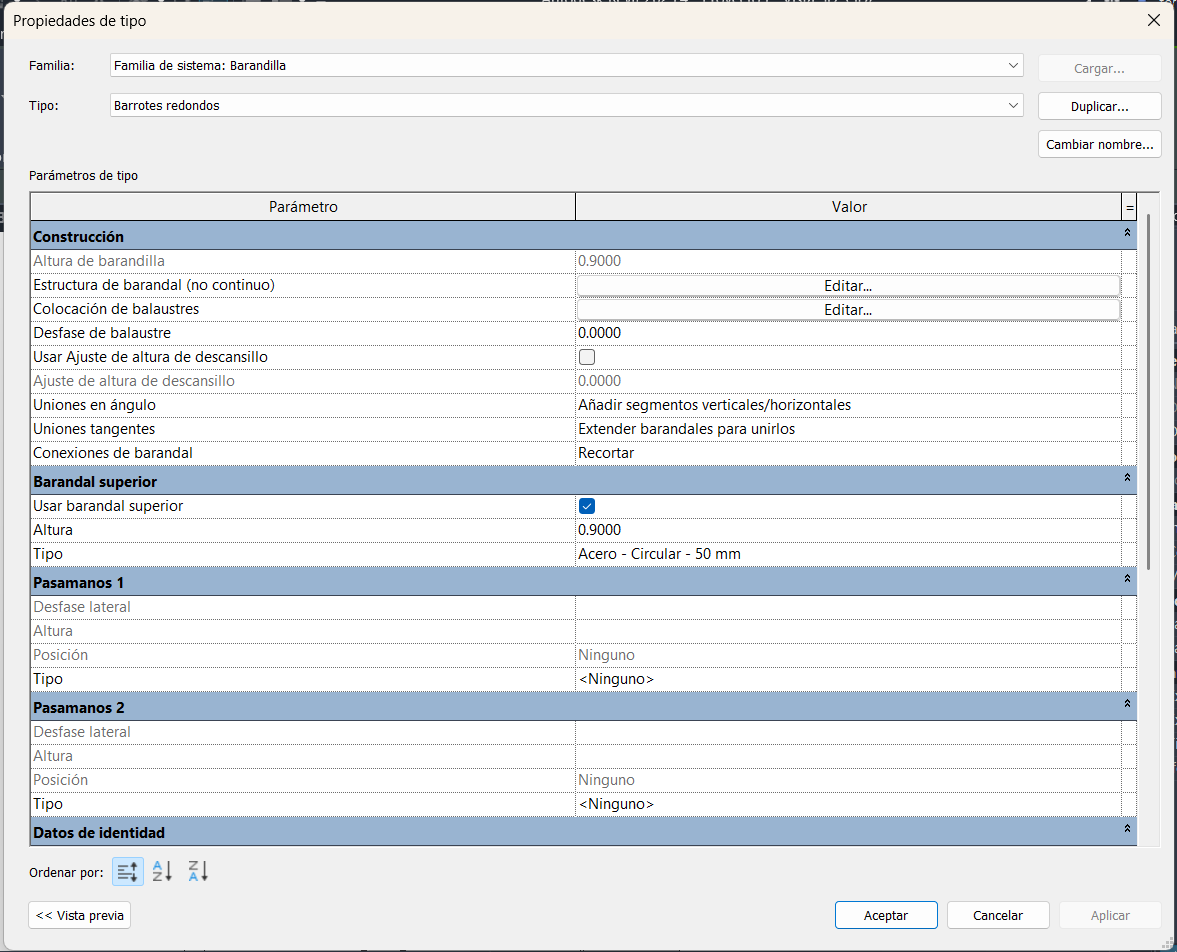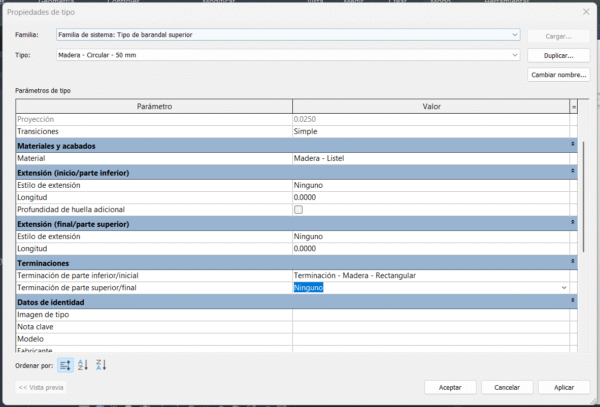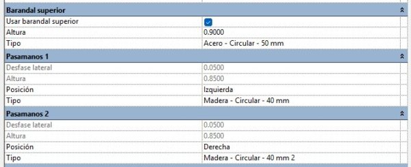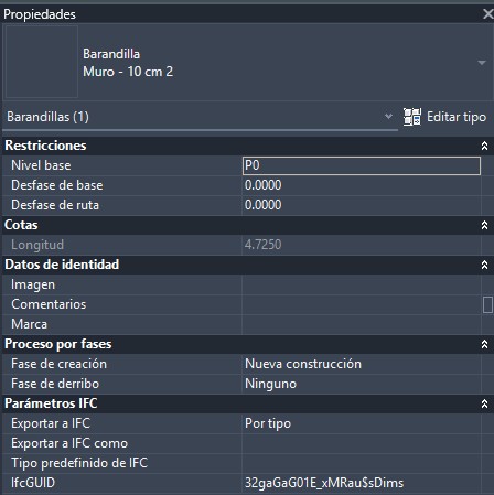 Si seleccionamos una barandilla observamos las siguientes propiedades de tipo: