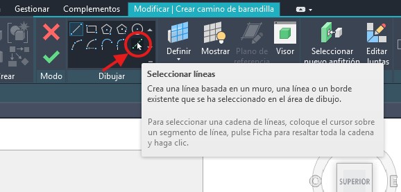 - 3º Seleccionar el camino de la barandilla: para una escalera, este camino será el borde donde queremos colocar la barandilla. Se recomienda usar la herramienta de «Seleccionar líneas».