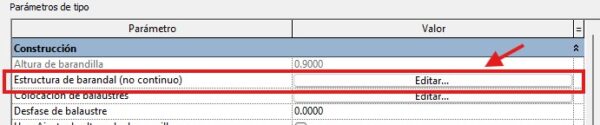 En las propiedades de tipo podemos seleccionar si queremos o no usar un barandal como superior. Esto no significa que no haya, si no que no tendremos un «predefinido» como el superior. Tendremos que «colocarlo» nosotros desde la estructura de barandal. Para editar esta estructura, accedemos a las propiedades de tipo y pulsamos en «Estructura de barandal»: