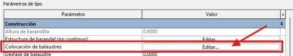 - Balaustre: son los elementos verticales de nuestra barandilla. Para editarlos debemos ir a la opción «Colocación de balaustres» dentro de las propiedades de tipo.