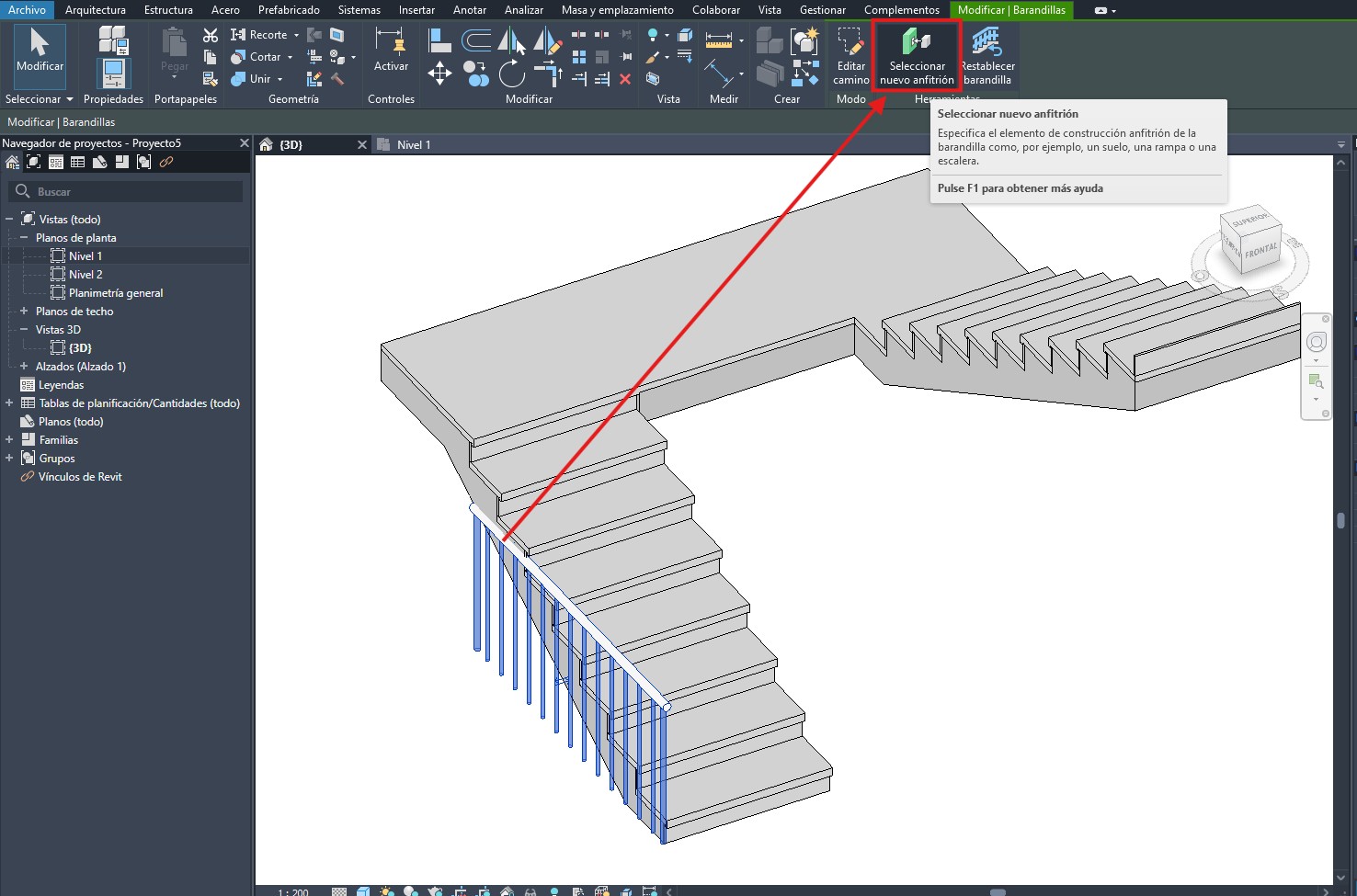 Es posible que la barandilla se cree en el nivel seleccionado y no en la rampa. Para solucionarlo podemos seleccionar la rampa y pulsar en la herramienta «Seleccionar nuevo anfitrión»