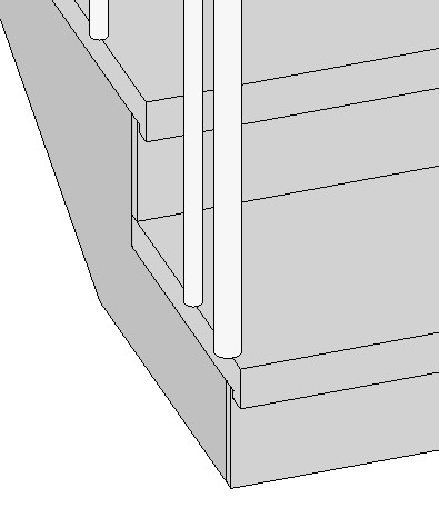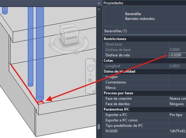Otro problema que puede surgir es el desfase de la barandilla respecto al borde. Para corregirlo sólo debemos seleccionar la barandilla y ajustar el desfase de ruta (la línea que hemos seleccionado antes) al que necesitemos.