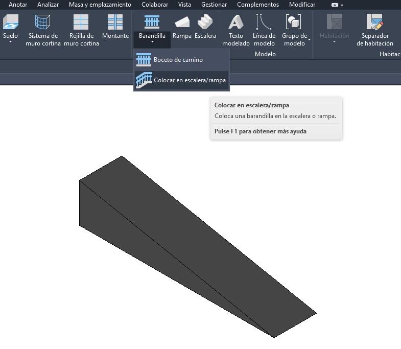 Por defecto, las rampas se crean automáticamente con barandilla. Si queremos crear una barandilla en una rampa ya modelada tenemos dos opciones: