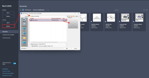 - Ventana principal: abriremos Revit, y en el menú izquierdo, en el apartado de Familias pulamos en «Nuevo…». Después buscamos la plantilla de masas in situ dentro de la carpeta de Revit, la seleccionamos y abrimos.