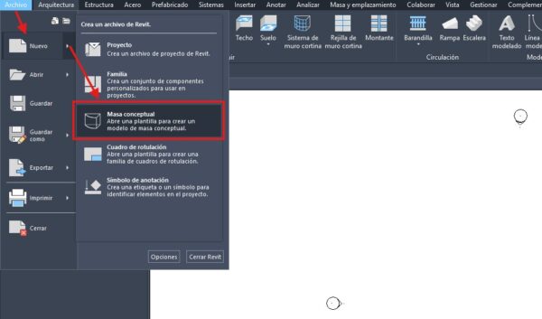 - Proyecto: podemos crear una masa desde un proyecto que tengamos abierto. Para ello debemos ir a la pestaña «Archivo», después seleccionamos «Nuevo» y finalmente «Masa conceptual». Al pulsar se nos abrirá la carpeta que contiene la plantilla mostrada en el punto anterior.