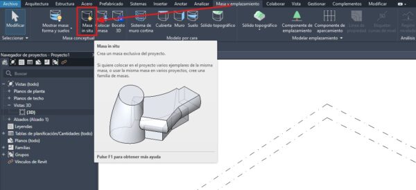 - Masa y emplazamiento: podemos modelar una masa in situ también desde un proyecto abierto con la herramienta de «Masa in situ» que encontraremos en la pestaña «Masa y emplazamiento» del menú superior. Esta masa será exclusiva del proyecto activo.