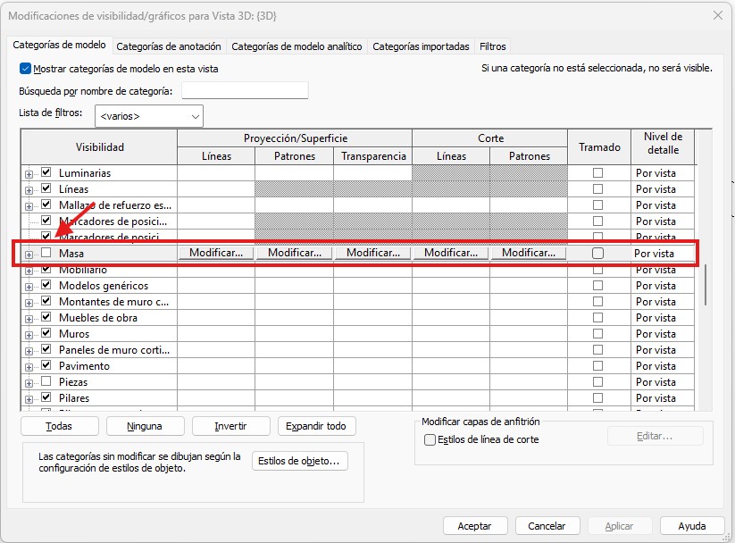 Para activar su visualización bastará con abrir la ventana de configuración de visualización de la vista (comando «VV») y yendo hasta el apartado «Masas». Veremos que está apagado, por lo que debemos activarlo nosotros.