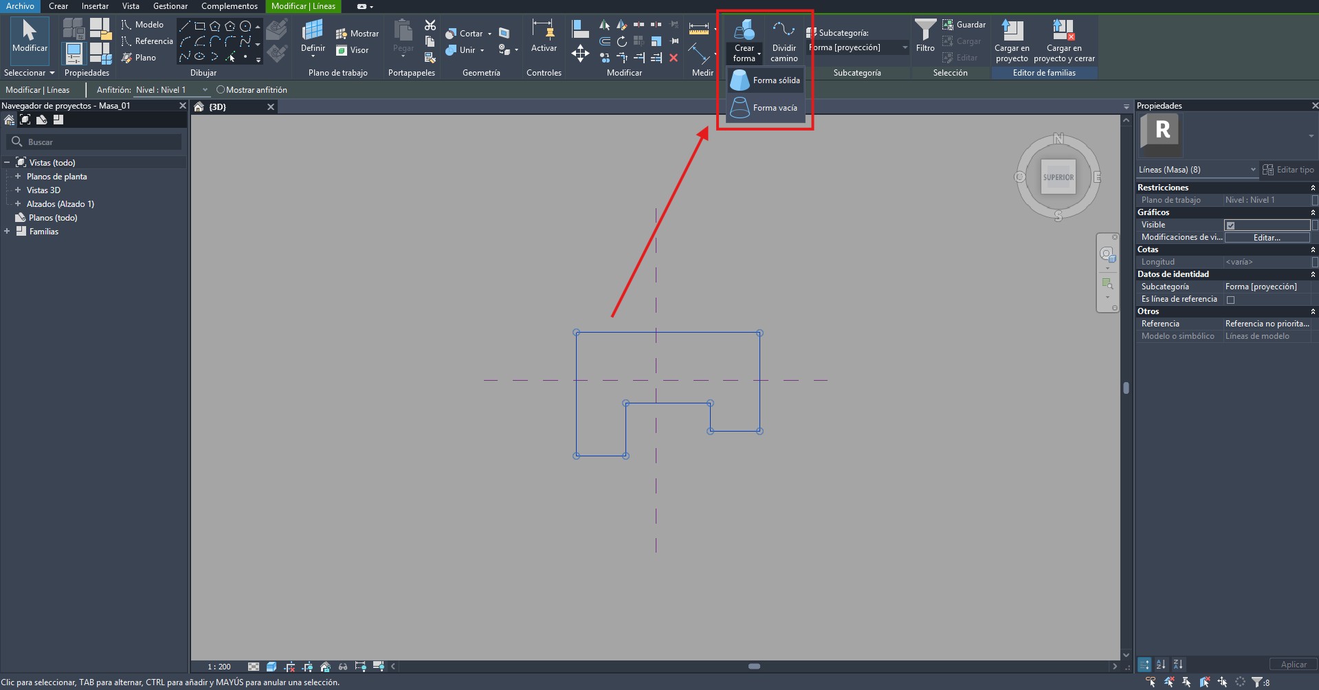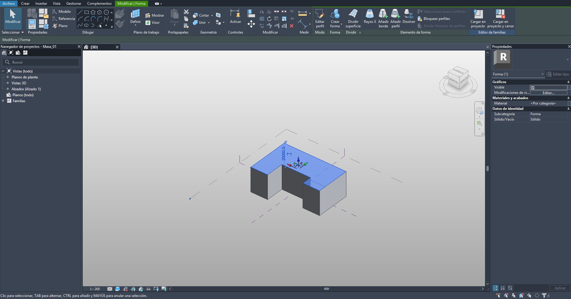 Cabe destacar que aquí la edición de la masa será más complicada pues no estamos en una plantilla de modelado, si no en la propia vista del proyecto, por lo que no suele ser muy recomendable.