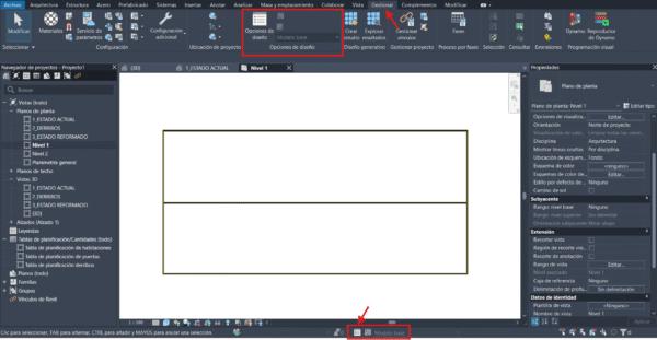 2. Barra de herramientas inferior. Abajo, por defecto, nos aparece un desplegable inhabilitado donde muestra «Modelo base» y a la izquierda un botón, el cual nos llevará a la herramienta de Opciones de diseño.