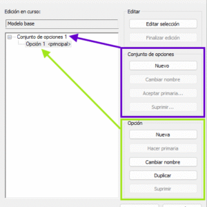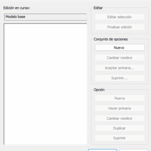 Tenemos disponibles varios botones de configuración tanto para el conjunto de opciones como para las opciones que forman dicho conjunto. Estos botones sólo se activaran cuando esté seleccionado el modelo base en el espacio de trabajo. Si estamos trabajando en alguna de las opciones, seguirán desactivados.