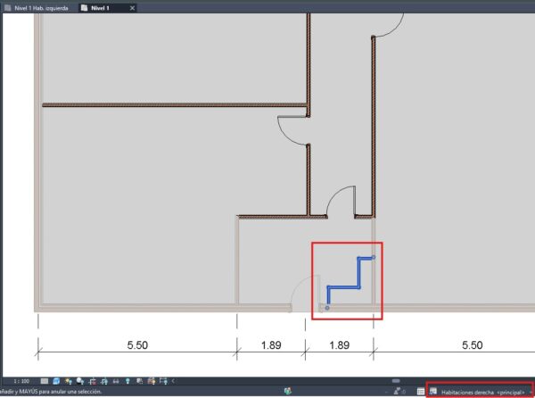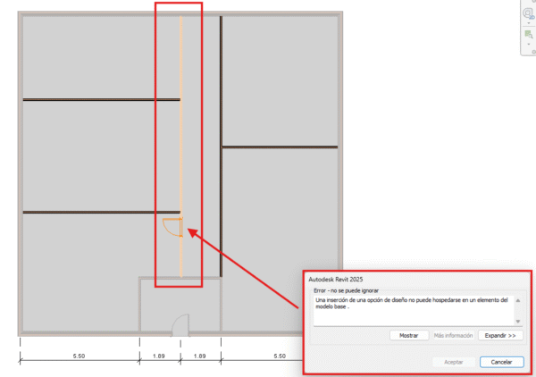 El siguiente paso sería insertar las carpinterías. No obstante, como hemos visto al principio, si queremos insertar las puertas en la disposición de habitaciones en la derecha nos dará un error puesto que no podemos modificar nada en el modelo base si estamos trabajando en las opciones.