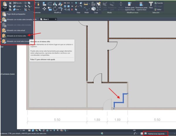2º- Pegar el elemento en la opción de destino dentro del nuevo conjunto. Este pegado no será el convencional, si no que debemos ir a la barra de herramienta superior, en la pestaña «Modificar», seleccionar el desplegable de la opción «Pegar» y seleccionar «Alineado en el mismo sitio».