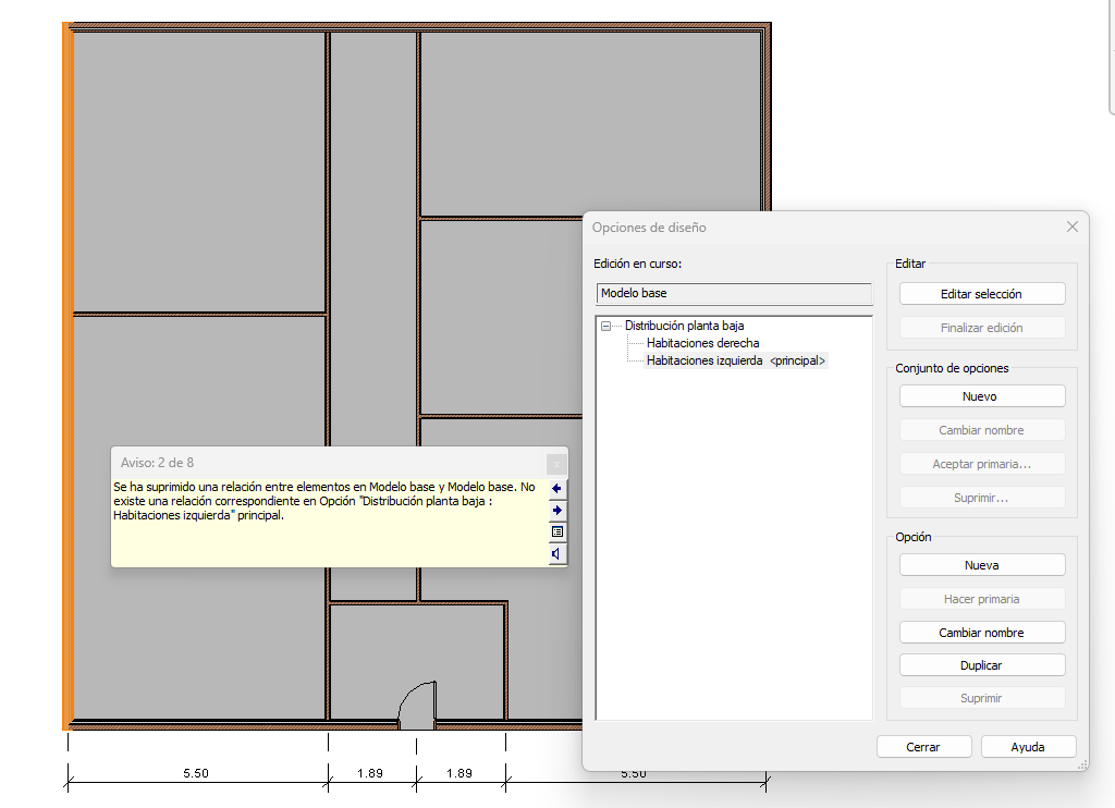 Nota: es posible que al cambiar de una opción principal a otro nos salte una aviso, que no necesariamente deben ser malos, sobre los cambios que implica esta modificación. En este caso nos indica que hay elementos que forman parte del modelo base que intersecan con los elementos de la opción elegida como principal: