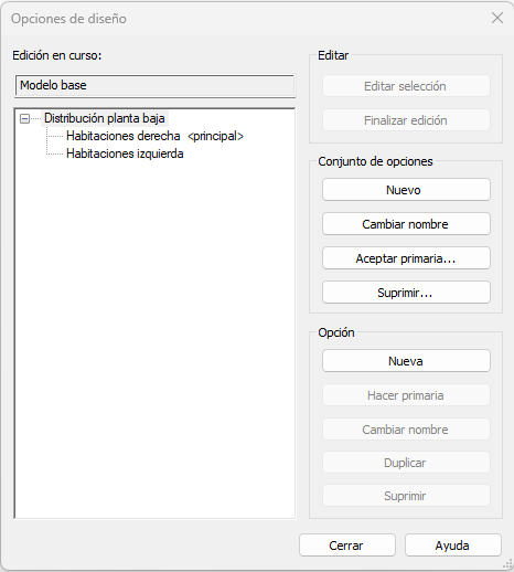 • Hacer primaria: convierte la opción en <principal>. Es decir, si visualizamos el modelo base, aparecerá lo modelado previamente en el modelo base más lo modelado en la opción principal.