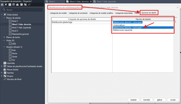 Si vamos a las vistas de nuestro proyecto, duplicamos un nivel y seleccionamos en las vistas duplicadas una opción, esa misma opción será la que se verá en el resto de vistas.