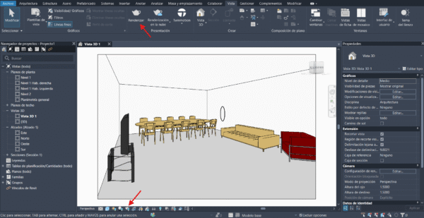 Lo primero que debemos hacer para realizar un renderizado en Revit es pulsar el icono de la tetera, situado en la barra inferior de herramientas o en la pestaña «Vista».