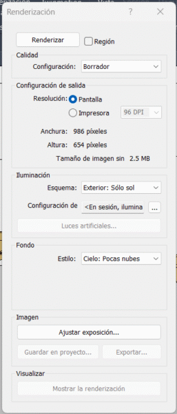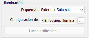 • Iluminación: nos permite configurar las luces en el renderizado. El sol representa la luz natural y la luz artificial la generada por las luminarias incluidas. En caso de no haber luminarias no habrá luz artificial.