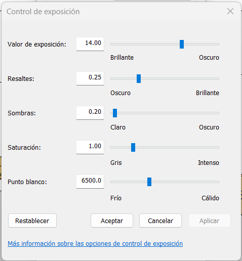 Si pulsamos en «Ajustar exposición» se abrirá una nueva ventana con los parámetros que podemos modificar: