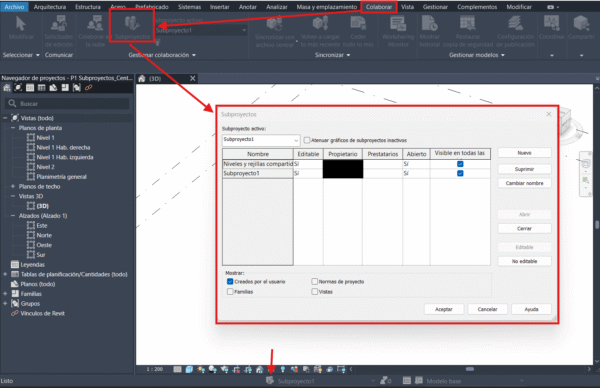 Un subproyecto es un “contenedor” de elementos dentro de un modelo colaborativo. Cada categoría de elementos (muros, mobiliario, instalaciones, etc.) puede estar asociada a un subproyecto independiente.