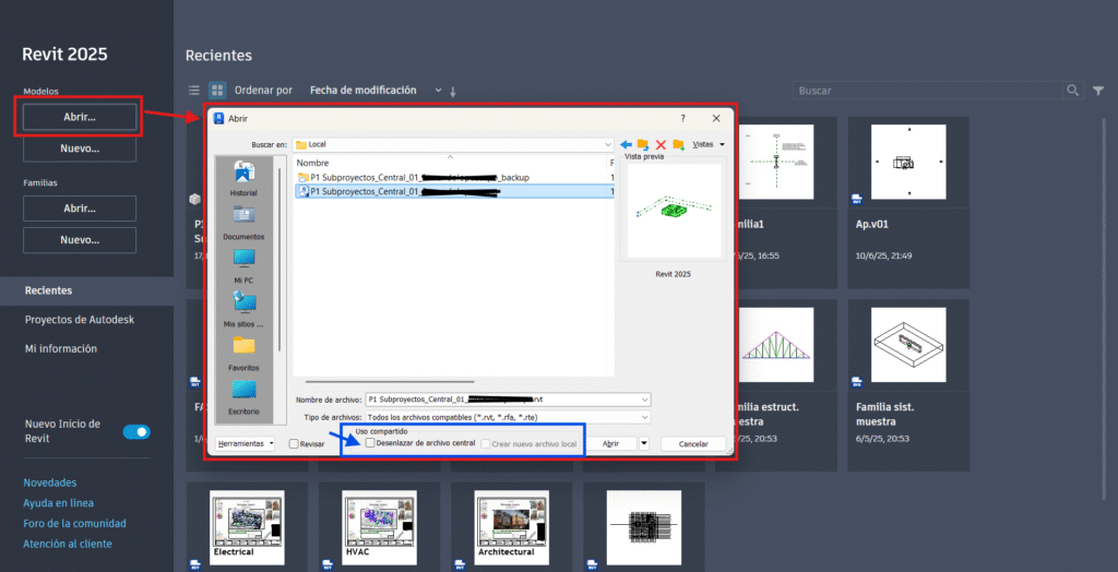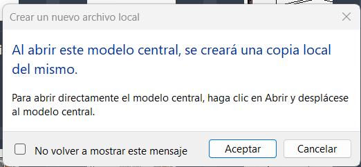 Básicamente lo que nos dice este aviso es que al abrir el archivo central desde la ventana principal de Revit lo que haremos será crear un archivo local. Si queremos abrir el archivo central propiamente dicho debemos ir a la opción «Abrir» y seleccionar dicho archivo.
