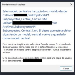 Importante: si movemos el archivo central desde su sitio original nos saltará un error al abrirlo la próxima vez, indicando dicho cambio y que ello ha provocado que pase a ser un archivo local (sin características de colaboración) y que para convertirlo nuevamente en central deberemos guardarlo nuevamente seleccionando la opción de convertir en archivo central.