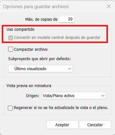 6º En la ventana de «Guardar como» pulsamos en «Opciones…» abajo a la derecha y veremos que por defecto está seleccionado la opción de convertir en modelo central.