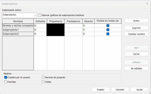 Nombre: nombre del subproyecto (ejemplo: Niveles y rejillas compartidos, Subproyecto1).