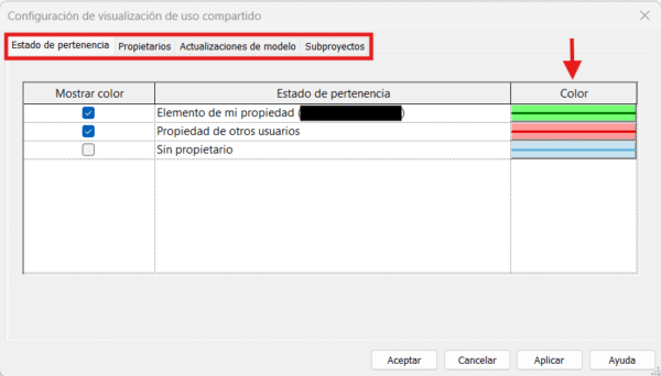 Configuración de visualización de uso compartido: permite personalizar colores y estilos gráficos para diferenciar elementos según subproyecto, propietario o estado de edición.