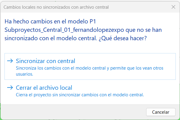 Esta ventana aparece cuando cierras un archivo local en Revit que está vinculado a un modelo central y todavía tienes en propiedad elementos o subproyectos que no has modificado.