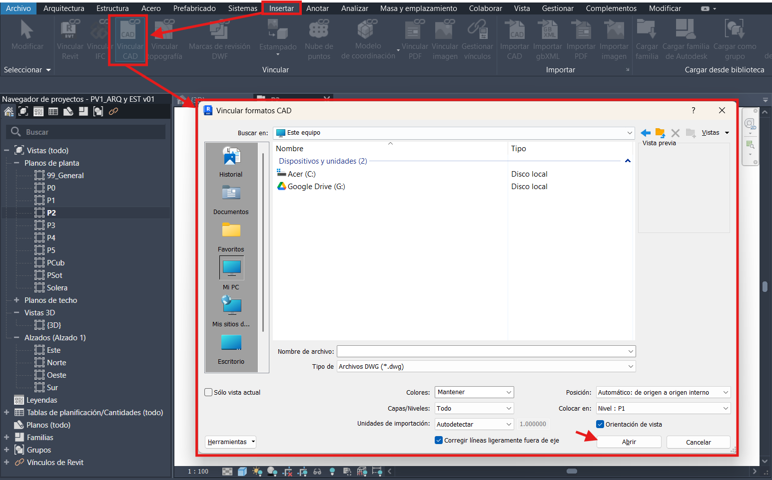 Para vincular archivos CAD seguimos los siguientes pasos: