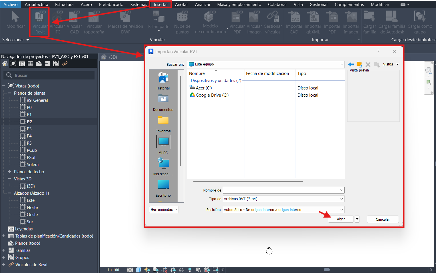 Para vincular archivos de Revit seguimos los siguientes pasos: