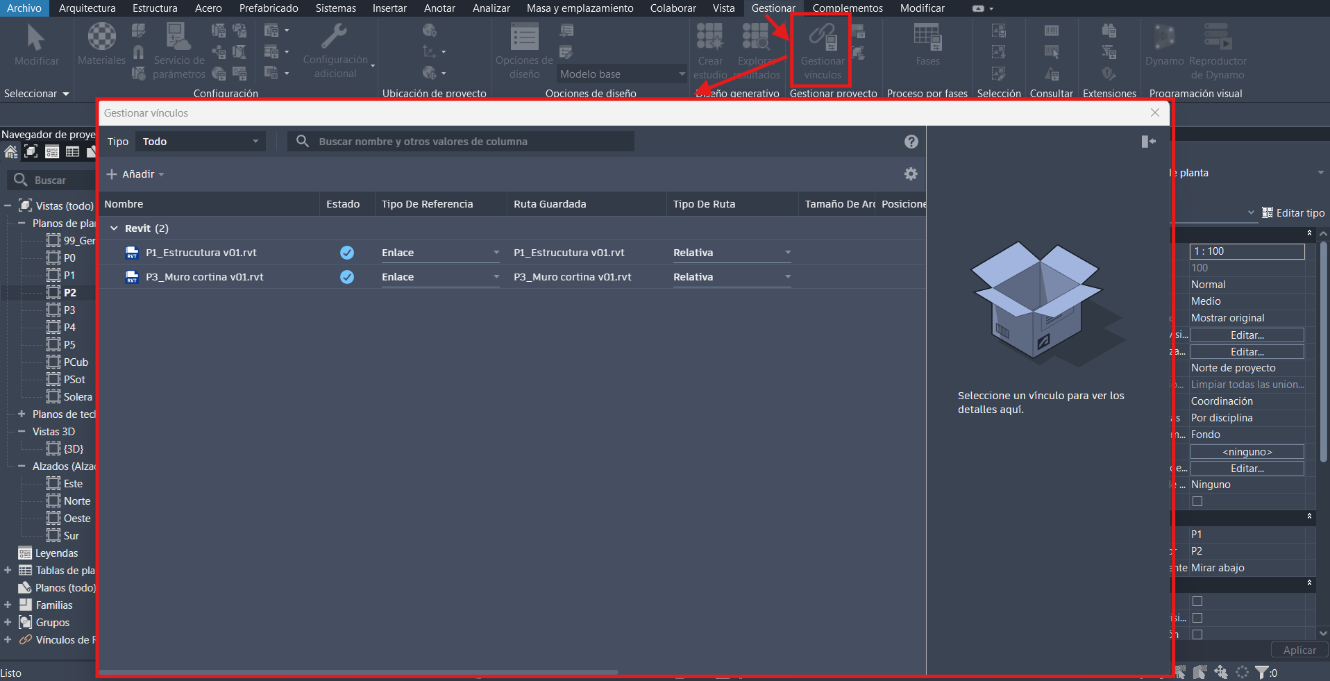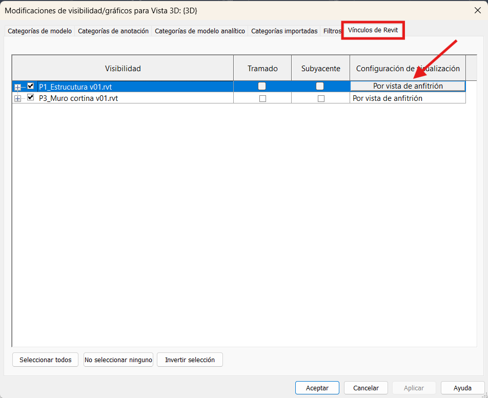 Podemos modificar la visualización completa o parcial de un vínculo en Revit. Para ello primero debemos acceder a la ventana de configuración de visualización del vínculo. Debemos seguir los siguientes pasos: