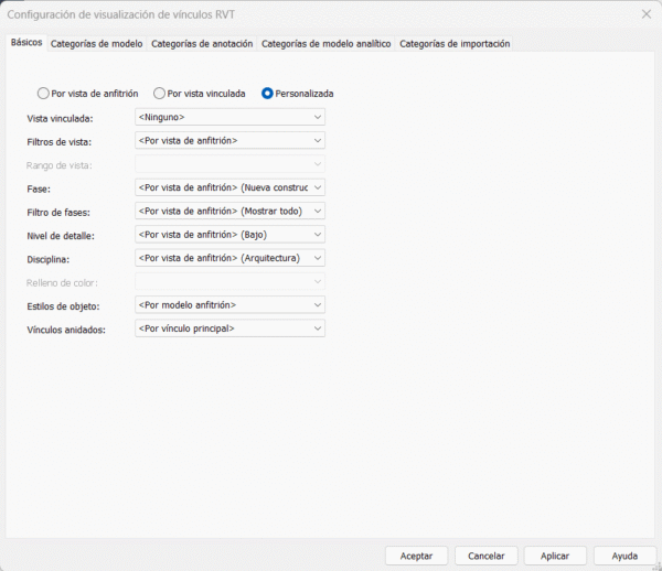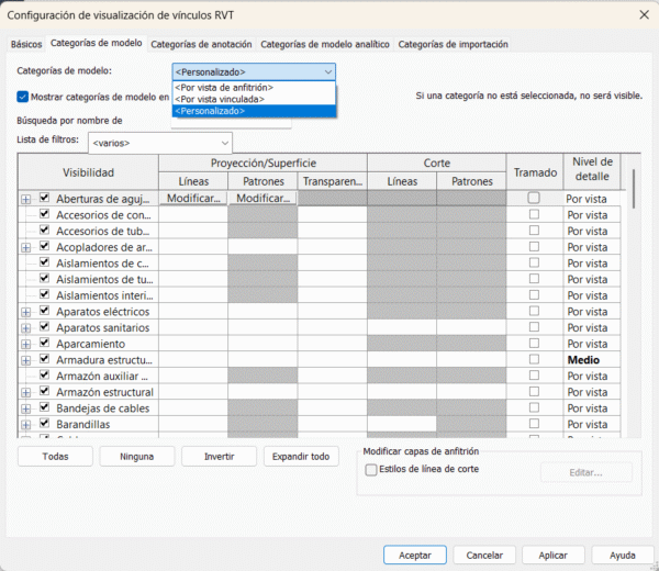 1. Ahora vamos a la pestaña «Categorías de modelo» cómo si de nuestro proyecto anfitrión se tratara y seleccionamos en categoría de modelo «Personalizado». Esto nos permitirá seleccionar las categorías y elementos que queremos visualizar o no de nuestro vínculo en el caso de archivo Revit.